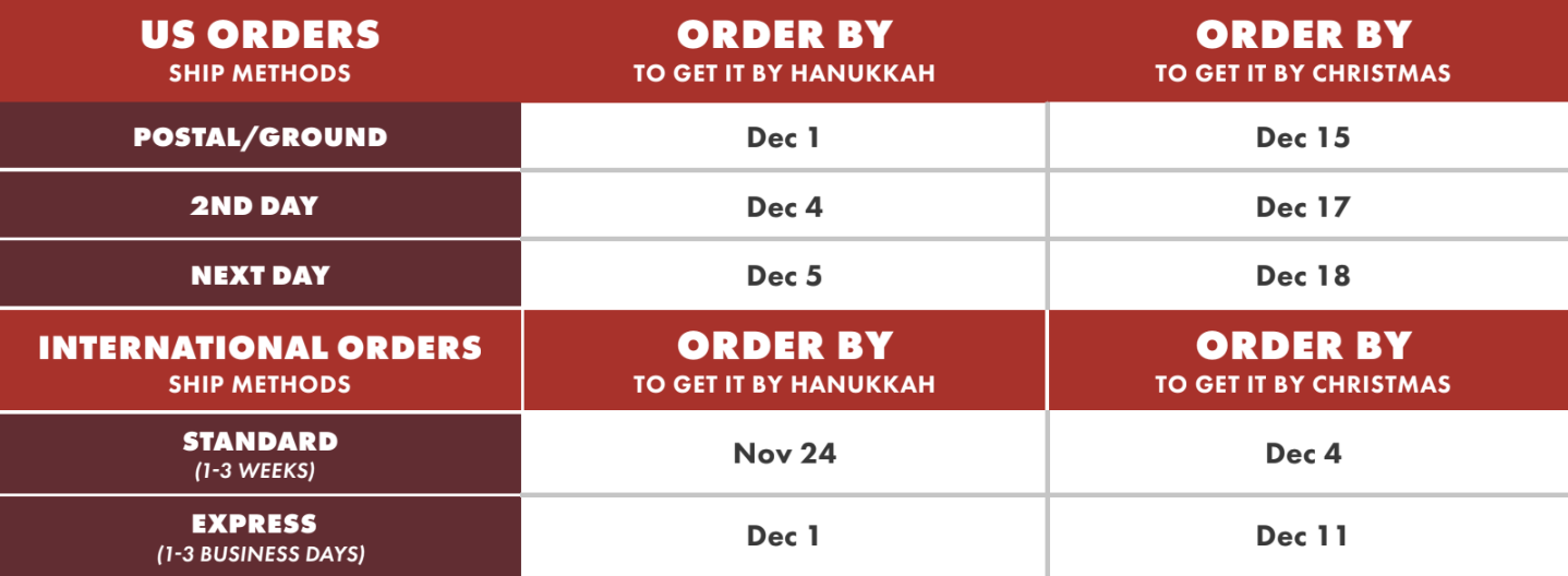 To help your gifts arrive in time for the holiday, check out these ordering recommendations. Be sure to accommodate time for both shipping and processing. Keep in mind, these dates are the last recommended dates for having a good (fingers crossed!) chance of arriving in time for the holidays. Because shipping carriers are slowed by increased demand from the holiday and online shopping, we cannot guarantee any delivery dates.